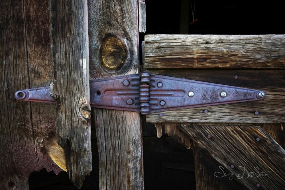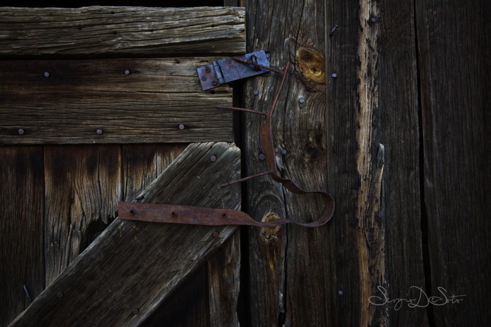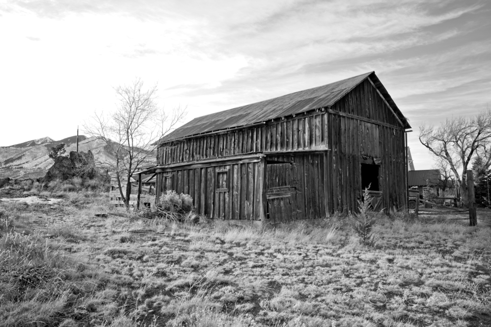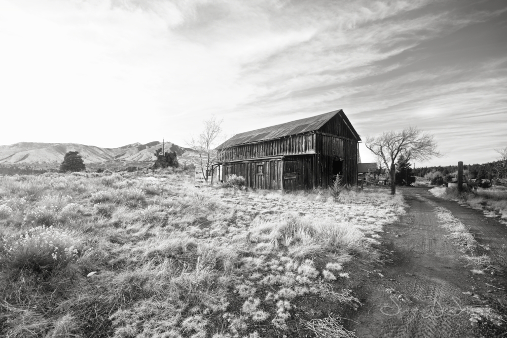 An early 1800s barn. Massive. Weathered to a silver-gray that no stain company could replicate. The barn door alone was worth the stop — the hardware, the lean, the weight of it. I spent more time on that door than most of the other structures combined. There's something about a door that's been opened ten thousand times by hands that are all gone now.