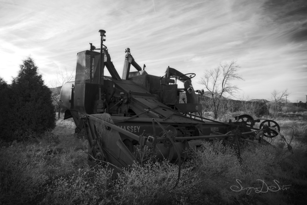 Inside, an old Massey Harris Special — a tractor from another era, parked like someone meant to come back for it and never did. Rust and quiet. Then the old feed barn behind it, leaning but not fallen. Still standing out of sheer stubbornness.